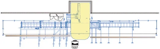 Опилки и другие отходы попадают в канал для удаления отходов. Оттуда они безопасно и эффективно транспортируются с помощью поперечного толкателя, встроенного в выходную часть машины, и затем направляются в последующие устройства для утилизации. В качестве альтернативы вместо скребка можно использовать ленточный транспортер. ROBOT-Drive может быть установлен на основание непосредственно на бетонном полу. Чтобы уменьшить высоту загрузки и удаления отходов, система утилизации отходов установлена в яме под зоной обработки.